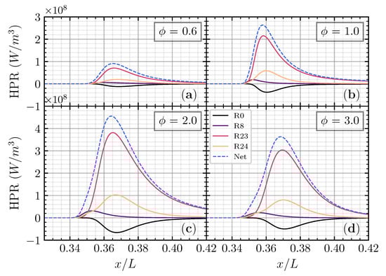The heat production rate was analyzed to understand the reaction that contributed to the heat release rate. Figure 8 shows that the major reaction contributed to the heat production rate of the CH4 addition on the CO/air flame as a function of non-dimensional axial distance () in different equivalence ratios. was chosen as this addition ratio is close to the CO/air flame case. As we observed previously, adding CH4 to the CO/air flame will increase both the laminar flame speed and net heat release rate compared to H2 and H2O in different and . Thus, the heat production rate analysis will be performed on CH4 in addition to the CO/air flame in various . R23 becomes the major contributing reaction to the heat production rate, followed by R24 and R8. R0 has a negative distribution, meaning that R0 has a heat-absorbing effect on the net heat release rate.