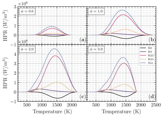 The third-body reaction R23 becomes the most contributed reaction with more than 60% contribution to the net heat release rate. The oxidation of the fuel (CO) to become CO2 is an essential reaction contributing to the net heat release rate through R23 and R24. The heat production from R24 has an almost proportional heat absorption of R0, making the net contribution to the total heat release of these two reactions limited. The third-body reaction R8 appears first compared to another reaction in every equivalence ratio, meaning that the heat produced from R8 initiates total heat release. Although the contribution from R8 is relatively small, it is essential to initiate the reaction. Figure 9 shows the major reaction contributed to the heat production rate of the CH4 addition as a function of temperature in different equivalence ratios. R8 has a peak in a relatively low temperature (<1000 K), while R0, R23, and R24 have a peak in a relatively higher temperature (between 1300 K and 1500 K).
