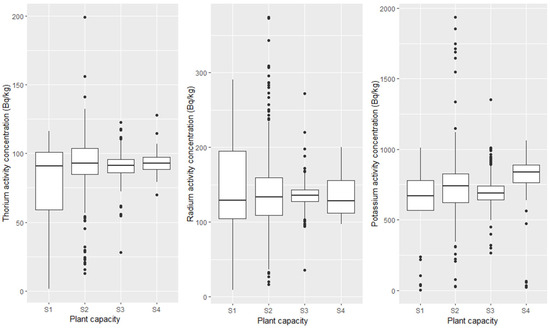 Radionuclide (Thorium—left panel; Radium—middle panel; Potassium—right panel) activity concentration depending on the capacity of the plant.