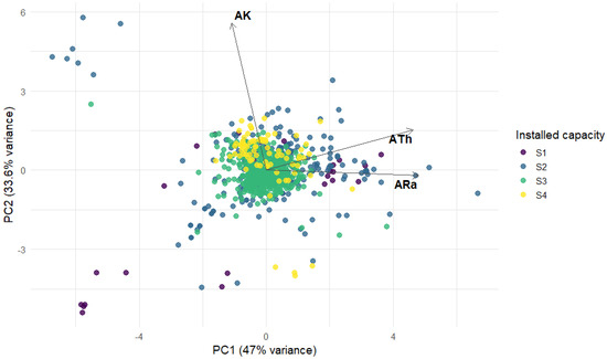Radionuclide activity concentration depending on plant capacity (PCA biplot). PC1, PC2—the first two components, which explain about 80.7% of the variability.