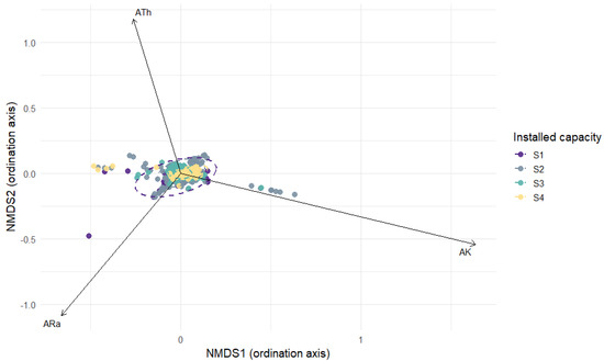PERMANOVA (Permutational Multivariate Analysis of Variance) was employed to evaluate whether the multivariate profile of radionuclide concentrations differs significantly between plant capacity categories. PERMANOVA is particularly suited for ecological and environmental datasets where assumptions of multivariate normality and homogeneity of dispersions are often violated. The method uses permutation testing to assess significance, making it appropriate for the present study. Its use enabled the simultaneous evaluation of all three radionuclides as a multivariate response, enhancing the analytical depth beyond what univariate comparisons can offer. Results from ordination techniques such as PCA and NMDS further supported and visualized the multivariate patterns, allowing the interpretation of variable contributions and group separations.