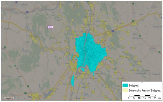 This study centres on Budapest, the capital and largest city of Hungary. As a key hub for the nation’s transportation network, Budapest features a densely populated urban landscape, an extensive and varied road system, and a heavy dependence on road transport. The city is home to over 1.7 million residents, with its metropolitan area housing a population surpassing 3 million [33]. Despite a declining national population, Budapest faces increasing transportation challenges as traffic demand grows [34]. Budapest features a diverse blend of urban and suburban zones, with central districts experiencing the heaviest road traffic. The city is served by major thoroughfares, including the M0 Ring Road that encircles the metropolitan area and primary routes linking Budapest to regional and international highways [35]. The road network in Budapest is divided into urban and rural zones to capture the variation in emission intensities between densely populated city regions and the less populated suburban or rural areas, as shown in Figure 1. The urban zone is designated as “Budapest,” while the rural zone is called “the Surrounding Areas of Budapest”.
