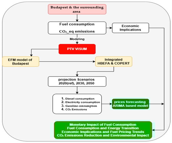 Transportation is a fundamental component of urban development, influencing economic growth, environmental sustainability, and public well-being. As cities expand and mobility demands increase, managing transport energy consumption and emissions becomes a critical challenge [1,2]. Budapest, Hungary’s capital and largest city, is inhabited by 20% of the population and serves as a key hub in European transportation networks. The city’s extensive transport system includes various modes, such as private cars, light commercial vehicles (LCVs), heavy-duty vehicles (HDVs), coaches, and mopeds. However, Budapest’s heavy reliance on road transport has led to significant environmental concerns, particularly regarding air quality and greenhouse gas (GHG) emissions [3,4,5].