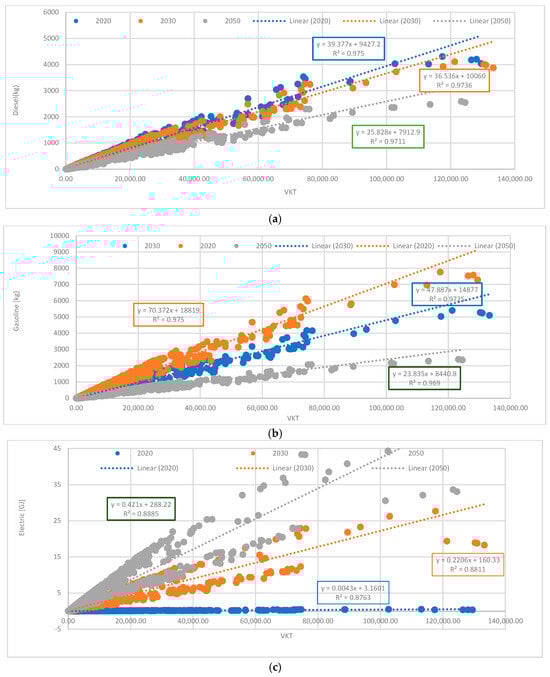 Linear regression of fuel consumption trends: (a) diesel, (b) gasoline, (c) electricity.