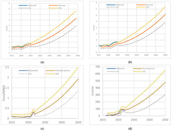 The ARIMA model projections for diesel, gasoline, and electricity prices demonstrate an increasing trend over time (Figure 4). Figure 3 illustrates the expected fuel price evolution, with a gradual rise until 2030 and a more substantial increase through 2050. The forecasting confidence intervals (LCL: Lower Confidence Limit, UCL: Upper Confidence Limit) indicate uncertainty in pricing but confirm the overall upward trajectory of fuel costs.
