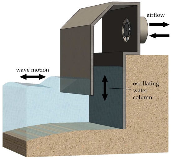 The researchers’ attention for wave energy has produced a number of different Wave Energy Converters (WECs), each exploiting a specific mean of interaction with the waves, hence being more or less suitable for different sites and power densities. Of particular interest are the systems based on the Oscillating Water Column (OWC) principle, given their reliability and applicability to a variety of locations (on- and off-shore) and collector platforms [3]. A WEC based on the OWC principle consists of a chamber (a caisson made of concrete [4] or even a natural cave [5]) open at its bottom and partially submerged under the free water surface as schematically represented in Figure 1. The external sea wave motion is converted into a reciprocating motion of a water column inside the air chamber, which, in turn, induces a similar movement of the air in the upper part of the chamber, where another opening is present. A Power Take-Off (PTO), generally an air turbine, is finally necessary to convert the pneumatic energy of the bidirectional airflow into mechanical energy available for electricity production, by means of a generator.
