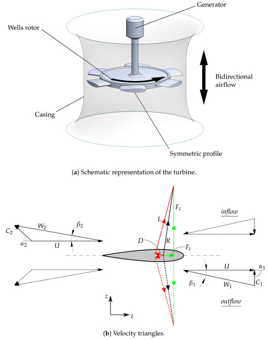 The Wells turbine, patented in the 1970s by Dr. A. A. Wells [7], is the most studied self-rectifying turbine for wave energy plants since its invention. Its rotor consists of symmetrical blades, originally made of NACA00xx profiles, staggered at 90 degrees with respect to the axis of rotation as sketched in Figure 2.