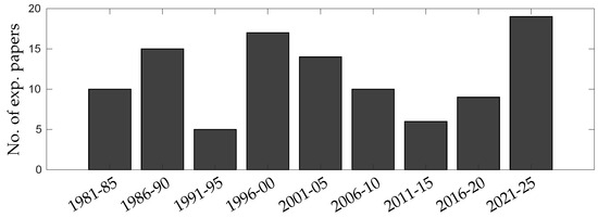 For a correct description of any fluid dynamic phenomenon, numerical results should be validated against experimental data [29,30]. For the particular case of the Wells turbine, a total number of more than 100 published experimental works can be found in the literature, evenly distributed in time since its invention. Figure 3 reports a timeline of published papers, grouped in periods of 5 years, since the early 1980s until today. This paper aims to provide a systematic classification of all the experimental works on Wells turbines available in literature, focusing on the experimental setup used to test the Wells rotor and on the level of detail of the measurements and analyses conducted, with particular attention given to the final goal of the experimental investigations. Other reviews on Wells turbines can be found in the literature. Raghunathan [8] published complete and extensive reviews in 1995, reporting on the operating principles, expected and measured performance, and alternative Wells turbine configurations, but this work is now dated, given the last 30 years of research. The more recent review written by Shehata et al. [31], collecting a large number (230) of papers, does not focus specifically on experimental works, but it is more centered on numerical approaches, in particular CFD, for analyzing Wells turbine performance.