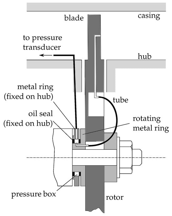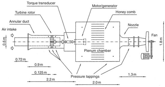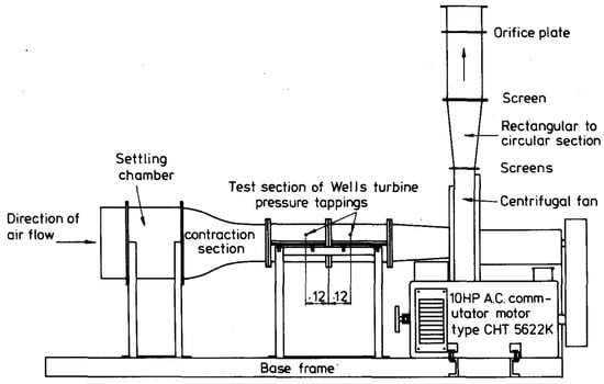 The first experimental characterizations of Wells turbines were conducted in the UK [40,41] using traditional unidirectional-flow test benches. The setup housed at Queen’s University of Belfast, the UK [37], is schematized in Figure 4.