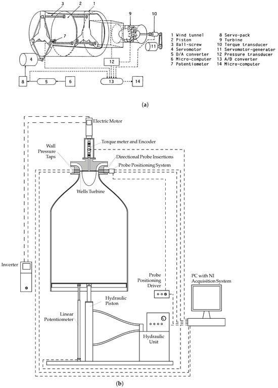 Oscillating flow test rigs. (a) Oscillating flow rig at Saga University (JP) [55]. Adapted with permission from [9], Elsevier, 2012; (b) OWC simulator with Wells turbine at University of Cagliari (IT) [62].