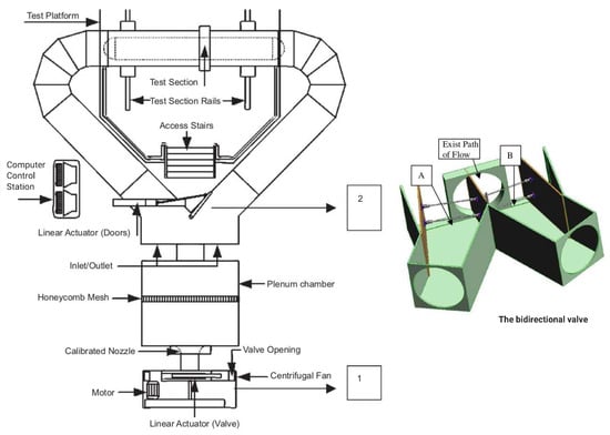 An ingenious configuration used to perform bidirectional flow experiments on Wells turbines is the one housed at the University of Limerick, Ireland [51]. It makes use of a directional valve in a traditional suction tunnel as schematized in Figure 7. A similar setup is installed at the University of Siegen, Germany [58]. The most relevant advantage of this particular configuration consists in the possibility to test Wells turbines using standardized airways under reversible flow using the unidirectional flow conditions established with a fan. The price of this configuration is a more complex configuration that typically results in less compact rigs than traditional oscillating ones that make use of pistons.