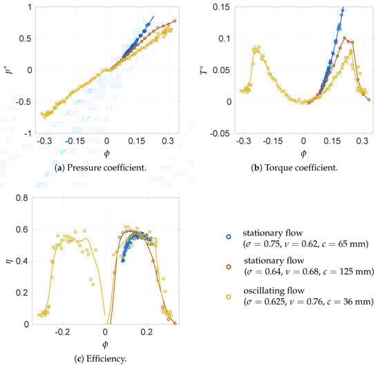 The non-dimensional pressure drop shows an almost linear dependence on the flow coefficient as initially observed from experiments in unidirectional flow rigs [37,41,57,80,85] and confirmed under oscillating flow conditions [84], while the torque coefficient follows a quadratic law as a function of until the stall occurs, identified by the steep reduction in both and [80,84]. These behaviors are in agreement with the predictions from basic fluid mechanics approaches [8,9], such as the potential flow theory experiments under oscillating flow conditions [56,61,85], providing an important confirmation of these results, except near the flow inversion. In particular, close to the inversion, i.e., where the flow coefficient attains values close to zero, the curve deviates from the linear trend, due to the very low incidence that the blades operate at and the interaction with the wakes coming from the neighboring blades. Based on Equation (4), an almost constant value of efficiency is expected at every operating condition, except near the inversions, where non-linearities produce very poor values of , and for values of larger than the stall limit. This is essentially confirmed by the experimental analyses shown in Figure 8c, with minor deviations from the expected theoretical trends. Torque coefficient and efficiency suddenly drop after the occurrence of stall due to the flow separation from the blade profile, while only a minor deviation in the slope can be observed for the behavior in Figure 8a for the same value of the flow coefficient, more visible in stationary flow experiments [80].