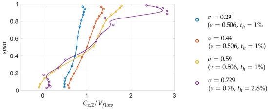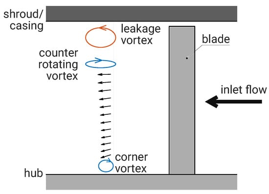 Limited information on the aerodynamics of the rotor can be drawn from global measurements, and the physics of the flow field near the Wells turbine can be only assumed based on the knowledge of the behavior of similar lifting surfaces. Only a few studies have focused on the “local flow”, i.e., they provided detailed analyses of the flow field inside the turbine using aerodynamic probes, typically multi-hole pressure ones or HWAs. The former are typically used to characterize the mean flow velocity both upstream and downstream of the rotor, typically neglecting the velocity contribution in the radial direction [37,43,46,92] or reconstructing the fully three-dimensional velocity field [56,93]. HWA probes can be important for rotors with relatively high values of the hub-to-tip ratio, where wall proximity effects and leakage flow interaction are expected to affect the flow field distribution. Figure 9 reproduces a representation of the outlet flow in the meridian plane of a Wells turbine [93], where secondary flow structures are observed using a 4-holes aerodynamic pressure probe to reconstruct the mean flow field close to the rotor.