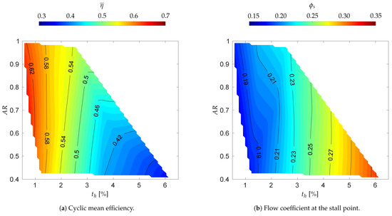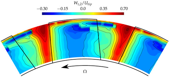 Licheri et al. [65] employed a slanted HWA probe to reconstruct the flow field inside the blade pitch of a Wells rotor, using the multi-rotation technique to evaluate the fully three-dimensional flow field downstream of the rotor. They characterized the flow distortion associated to (a) the constant-chord design of the rotor, (b) the leakage flow through the tip gap, and (c) the obstruction at the blade root. They used this information to locate the least performing regions inside the blade pitch. A representation of the outlet axial velocity component in two adjacent blade vanes for a Wells rotor prototype is shown in Figure 10, where the regions affected by the leakage flow are clearly highlighted at larger radii by low, and even negative, values of , thus altering the flow field distribution.