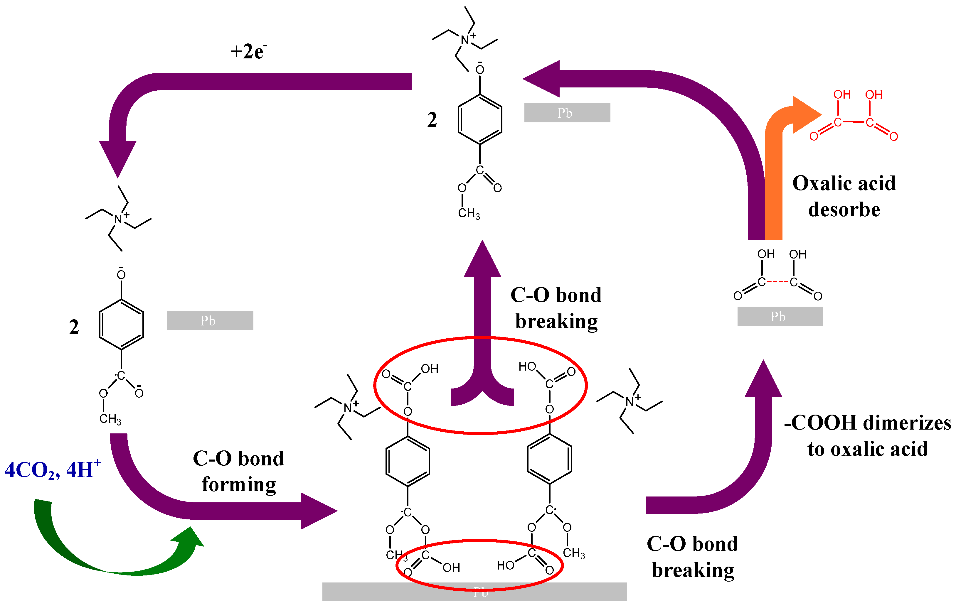 - Yang, Y.L.; Gao, H.S.; Feng, J.Q.; Zeng, S.J.; Liu, L.; Liu, L.C.; Ren, B.Z.; Li, T.; Zhang, S.J.; Zhang, X.P. Aromatic Ester-Functionalized Ionic Liquid for Highly Efficient CO2 Electrochemical Reduction to Oxalic Acid. ChemSusChem 2020, 13, 4900–4905. [Google Scholar] [CrossRef]