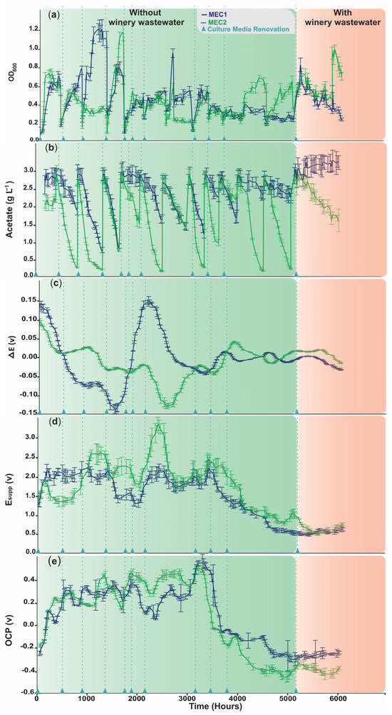- Marchetti, A.; Moreno, M.C.; Lauri, R.; Zeppilli, M. Hydrogen production through efficient organic matter oxidation performed by microbial electrolysis cells. Processes 2025, 13, 1231. [Google Scholar] [CrossRef]