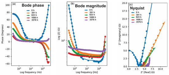 - When several spectra separated by thousands of hours are superimposed, Nyquist loci of successive measurements overlap strongly in the high-frequency quarter circle, masking subtle shifts in the solution resistance and high-frequency constant phase element (CPE) exponents. Plotting |Z| and °/Z against log f allows each spectrum to be displayed without overlapping.