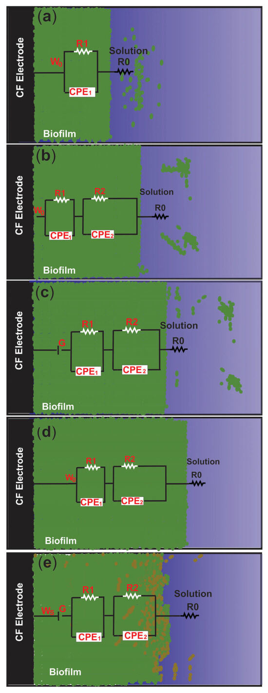 | 2 | R0–[R1‖CPE1]–[R2‖CPE2]–Wo | 391 | The second time constant appears as the biofilm forms |