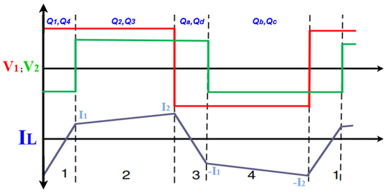 Switching diagram of DAB converter with waveforms generated by the bridges [4].