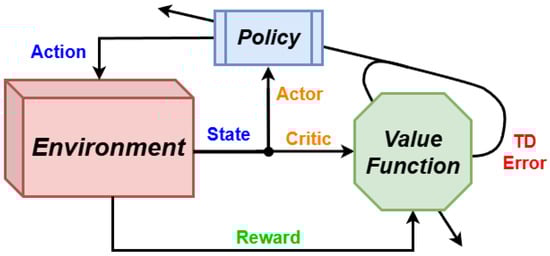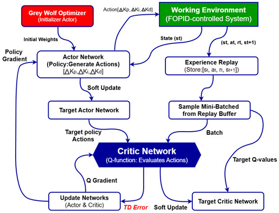 Looking at Figure 4, we can give a clear clarification of our proposed method. As illustrated in Figure 4, the RL process follows an actor-critic architecture. Each component plays a critical role in optimizing the FOPID controller’s parameters. The reward signal, as shown in Figure 4, flows from the environment to the critic. It reflects the system’s performance, guiding the learning process to minimize tracking error, reduce oscillations, and balance control effort, thereby optimizing the FOPID controller’s behavior.