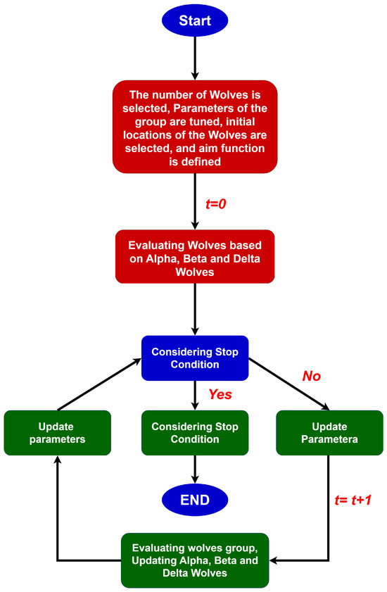 The GWO algorithm is a nature-inspired metaheuristic, which mimics the social hierarchy and hunting behavior of Grey wolves. The algorithm simulates the hunting process through encircling, attacking, and searching for prey. The wolves’ positions are updated based on the alpha, beta, and delta wolves, which represent the best solutions found so far.
