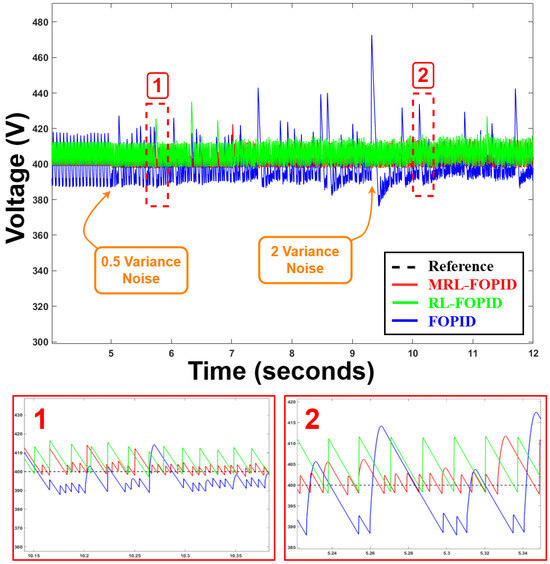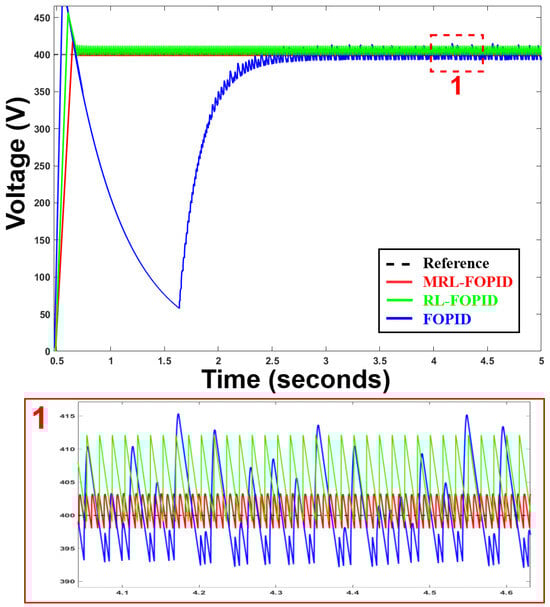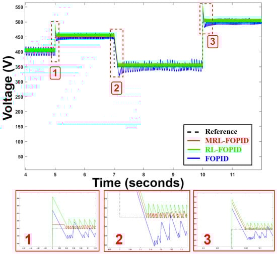The next case is devoted to testing the performance of the controllers under sudden reference signal changes (Figure 8), where the reference voltage shows fast swings to measure the robustness and adaptability of every control strategy. The MRL-FOPID controller performs better in this case by exactly tracking the abrupt changes in the reference voltage with minimal overshoot and fast settling times. Maintaining a steady and smooth response, the controller effectively reduces oscillations during transitions. Although it has slightly more overshoot and longer settling times than the MRL-FOPID controller, the RL-FOPID controller shows reasonable adaptability to the reference changes with obvious oscillations during the transitions. Conversely, the FOPID controller shows major overshoot, prolonged settling time, and strong oscillations as it attempts to fit abrupt changes in the reference signal, therefore indicating its lack of robustness. These outcomes emphasize the MRL-FOPID controller’s superior capacity to control challenging and dynamic operating conditions.