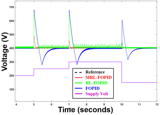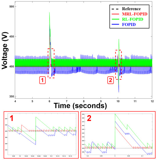 Firstly, the tracking performance of the controllers are tested in Figure 7 with a load of . The performance comparison of the controllers on the DAB converter system, with a supply voltage of 300 V and a reference voltage of 400 V, highlights the effectiveness of the MRL-FOPID controller.