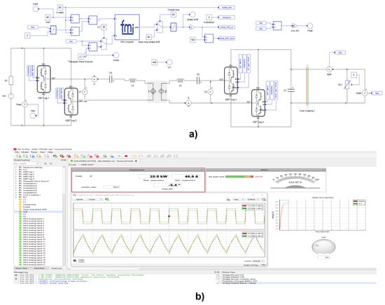 Figure 3 displays the averaged model of the DAB converter with a CLLC filter, which attempts to accurately depict the behavior of the system under CCM conditions. Since this model only represents the average behavior of the converter during a single switching period, it acknowledges the high frequency switching of the converter. Investigating and tracking the voltage output () for the system inputs and disturbances is the aim of this model.