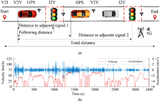 Under dynamic traffic conditions, CAR-EEV vehicles cannot rely solely on SPaT for speed planning to achieve green-wave passage. The timing of preceding vehicles passing through traffic signals is considered in the connected vehicle-following scenario. The traffic information framework of a CAR-EEV is shown in Figure 1a, while the velocity and acceleration selected as the testing set are shown in Figure 1b.