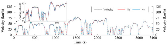 The speed prediction algorithm based on the acceleration sequence is simulated to compare the predicted speeds when the prediction domain is 8 s and 4 s. The fitting effect with the actual speed and simulation results are shown in Figure 2.
