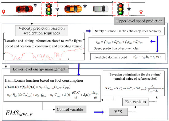 The coexistence of connected and non-connected vehicles in mixed traffic flows is identified as a defining characteristic of early-stage intelligent connected driving environments. In connected car-following scenarios, preceding vehicle dynamics are perturbed by non-connected agent interactions and traffic signal variations, inducing operational complexities, including congestion-induced stationary states, emergency braking-triggered abrupt deceleration, and signal phase misinterpretation-driven red light violations. Such stochastic disturbances substantially escalate uncertainties in eco-vehicle velocity optimization. To address CAR-EEV control demands under dynamic traffic conditions, coordinated speed-energy management strategies are prioritized, integrating the MOO of traffic flow efficiency, safety distance compliance, and fuel economy enhancement. The implemented dual-layer energy management framework is architecturally shown in Figure 3.