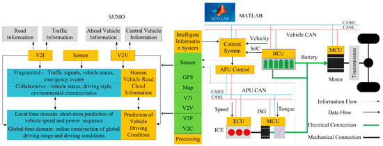 CAR-EEV is characterized as an electromechanical hybrid power system jointly driven by multiple energy sources, where precise modeling of its powertrain system and components is established as the fundamental basis for EMS research. Detailed component-level modeling of CAR-EEV powertrains is conducted utilizing AVL, encompassing dynamic system architectures, APU configurations, battery modules, DC/DC converters, and drive motor characteristics. The degradation mechanisms of the battery systems are analytically examined with corresponding lifespan deterioration models formulated. Traffic simulation scenario frameworks are constructed to enable subsequent traffic information-driven vehicle speed prediction studies. The topological structure of the powertrain system for a CAR-EEV is shown in Figure 4.
