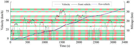 It can be observed that during the car-following process, the trajectory curve of the eco-vehicle is maintained along the green line with synchronized arrival time relative to the preceding vehicle at 3400 s, satisfying trafficability requirements. At intersections, the trajectory of the preceding vehicle is precisely followed by the eco-vehicle, and no red light violations are observed throughout the process. When the preceding vehicle is halted by a red light, coordinated stopping is achieved with the eco-vehicle maintaining proximity to the preceding vehicle, where smooth traffic flow is ensured and the effectiveness of the speed planning strategy in maintaining following performance and traffic efficiency is validated.