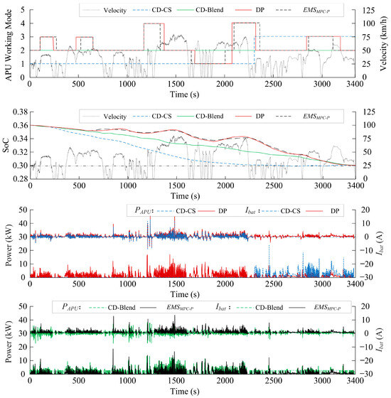 The EMSMPC-P achieves energy consumption economy comparable to DP-based global optimization while demonstrating superior equilibrium in battery capacity degradation mitigation relative to DP and CD-CS strategies. This approach synergistically optimizes battery longevity and system economics through operational condition simulations, validating EMSMPC-P advantages in energy cost reduction, lifespan regulation, and control robustness across diverse driving scenarios (Figure 6). As the primary energy supply unit for hybrid electric vehicles, the APU system satisfies fundamental power demands. Battery-integrated APU configurations attenuate load power fluctuations through responsive energy buffering, thereby extending APU service life. The EMSMPC-P incorporates a battery SoC preservation coefficient within its reward function to explicitly address lifespan considerations. The EMSMPC-P framework defines four operational modes: (1) CD-EV Mode: Electric propulsion dominates, with the CD strategy managing battery charging during power surplus. (2) CD-Blend Mode: APU engagement balances dual-energy utilization, progressively increasing power contribution as reserves diminish while maintaining a certain percentage of power. (3) CS-Blend Mode: CS strategy stabilizes battery SoC via engine-dominant propulsion with concurrent charging. (4) DC Mode: Predictive congestion-triggered battery replenishment through dynamic charging during motion.