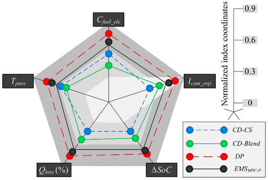 From the comparison of the normalization parameters, it can be seen that the CD-Blend strategy outperforms the CD-CS strategy in terms of Qloss and SoC, and the proposed EMSMPC-P is the closest to the DP-optimal solution in all the parameters.