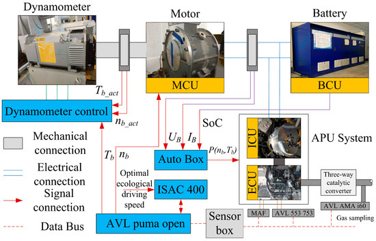 EMSMPC-P was formulated and simulated offline, with adaptive control model recalibration required for real-world deployment to ensure real-time functionality. The experimental protocol comprises: (1) vehicle parameters and driving cycles conditions being loaded into road load simulation software; (2) AVL system emulation of road loads via closed-loop control of speed and torque of the motor/dynamometer; (3) real-time electric power calculation through DC bus voltage-current monitoring; (4) battery SoC-driven EMS execution generating engine/generator speed-torque commands; (5) APU power coordination determination. Four-strategy validation experiments were conducted with calculated APU power as tracking targets. The structure of the experimental platform is shown in Figure 8.