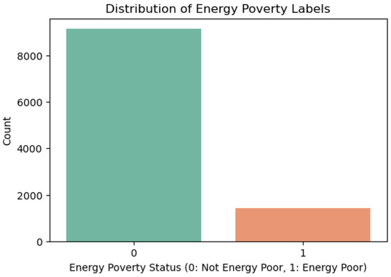 - Class weight adjustment: Another effective approach is adjusting class weights in the model’s cost function, assigning higher weights to the minority class to make misclassification more costly and to improve recall for fuel-poor households [55]. For RF, we set class weight as “balanced”, which automatically assigns weights to be inversely proportional to class frequencies, reducing bias toward the majority class. For XGBoost, we adjust the algorithms with the scale pos weight parameter, which is typically calculated as the ratio of the number of negative samples to the number of positive samples in the training data. This adjustment ensures that the model gives sufficient importance to the minority class, enhancing its ability to correctly identify fuel-poor households.