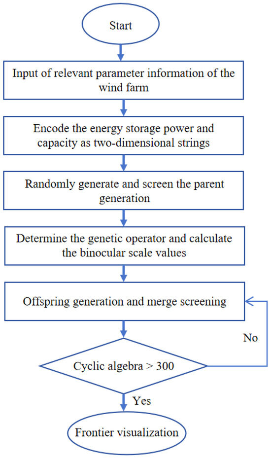 28]. This study utilized NSGA-II to optimize the capacity of offshore wind power integrated with electrochemical energy storage. It thoroughly analyzed the performance data of offshore wind farms and preliminarily established a potential range for energy storage capacity, and thus, reduced the computational effort required in subsequent optimization steps. In this study, the energy storage power was randomly initialized within the range of 0 to 12 MW, and the rated capacity was randomly initialized within the range of 0 to 48 MWh. An initial population of 20 individuals was generated, with each individual representing a potential energy storage configuration. In each generation, 60 offspring were produced through genetic operations, and 20 individuals were selected to form the next generation to maintain a constant population size. The crossover and mutation probabilities were both set to 0.5, and the algorithm iterated for 300 generations. The simplified procedural steps are illustrated in