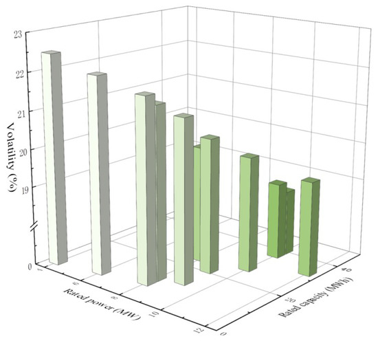 Figure 5 respectively show the impacts of changes in the rated power and rated capacity of energy storage system on the overall investment cost of the energy storage system and the output power fluctuation of offshore wind power after storage. In this study, the rated power variation range of the energy storage system was set at 10–30% of the rated power of wind farm. At the same time, the continuous working time of the energy storage was changed from 1 h to 4 h. Through the analysis, it is found that with the increase in the power and capacity of the energy storage system, the output power volatility of the wind farm after the configuration of the energy storage decreased from 22.48% to 18.63%, the volatility reduction rate increased from 5.29% to 21.18%, and the investment cost of the energy storage system increased from CNY 67.04 million to CNY 520.45 million. This trend suggests that in order to achieve better smoothing, more energy storage systems are needed to smooth out the wind power output fluctuations and reduce its instability. In addition, with the increase in cost, we observed that the overall smoothness of the output power curve after the allocation of wind power storage was significantly improved.