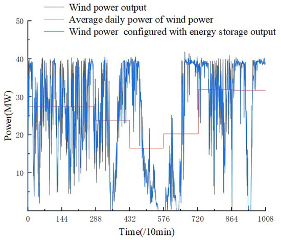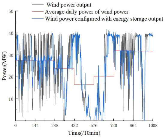 Figure 8 respectively show the comparison of the output power before and after the wind farm was configured with 10% energy storage and 25% energy storage. It can be clearly seen that the overall output curve was smoother when the wind farm was configured with a high proportion of energy storage.