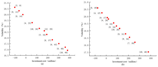 Table 7), we found that MOPSO achieved a lower investment cost at its selected point, whereas NSGA-II more effectively suppressed the volatility. Consequently, NSGA-II outperformed MOPSO in the multi-objective optimization. Under equal weighting of the cost and volatility, the optimal energy storage configuration was a rated power of 4 MW with a rated capacity of 28 MWh.