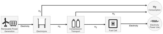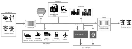 Due to its characteristics as an energy carrier, green hydrogen is considered a crucial element in the energy transition. It enables the use of renewable energy in sectors responsible for significant portions of emissions, such as transportation and heavy industry [9,12,13]. Hydrogen also functions as a buffer for intermittent renewable energy generation, allowing excess energy to be stored and later converted into heat or electricity [14,15]. Additionally, green hydrogen facilitates the integration of renewable generation, helping address the growing mismatch between generation and load throughout the day, improving grid stability and optimizing the use of renewable resources [16,17].