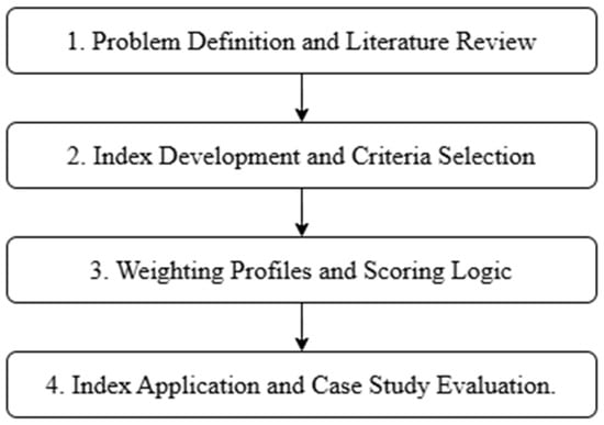 This study followed a structured methodology designed to support the development, justification, and application of the GHEI. The research process was divided into four main phases, as shown in Figure 2.