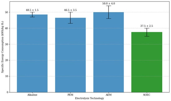 Figure 4 presents a comparative chart showing the reported energy consumption for each electrolysis technology analyzed. The more efficient technology is emphasized in green.