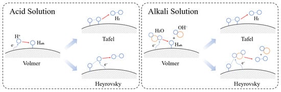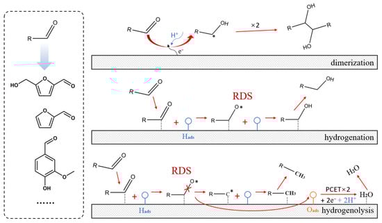 Electroreduction proceeds through different pathways in acid and alkali solutions, but both involve the adsorption and desorption of hydrogen ions on the electrode surface, as shown in Figure 2. The first step is the Volmer reaction. Protons or water are electrochemically adsorbed onto the electrode surface to form adsorbed hydrogen (Hads). Hads can participate in the electroreduction of most organic compounds, such as hydrogenolysis and hydrogenation of aldehydes and hydrogenolysis of alcohols. However, the reaction pathway for dimerization is still under investigation. Most studies suggest that the reduction utilizes hydrogen ions (H+) from the solution rather than Hads. Generally, the hydrogen evolution reaction (HER) of water electrolysis [] is considered a competing reaction with the electroreduction of biomass-derived platform compounds. Because it follows the Volmer reaction, the HER will proceed via the Heyrovsky or Tafel steps, consuming H+ and Hads, reducing FE, and hindering the reduction of organic substrates. Thus, efficient catalysts must suppress the Heyrovsky and Tafel reactions.