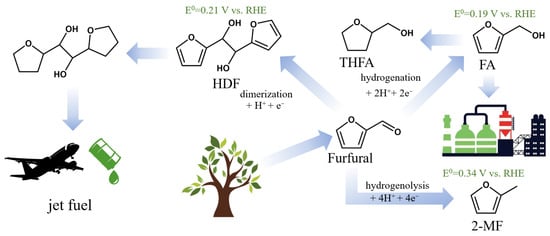 - Jiang, M.; Tan, J.; Chen, Y.; Zhang, W.; Chen, P.; Tang, Y.; Gao, Q. Promoted Electrocatalytic Hydrogenation of Furfural in a Bi-Phasic System. Chem. Commun. 2023, 59, 3103–3106. [Google Scholar] [CrossRef]