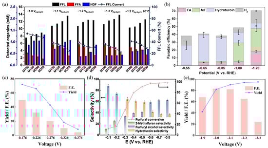 In addition to catalyst design, the applied potential significantly affects product selectivity. Most studies suggest that HDF tends to form at relatively low potentials, as illustrated in Figure 6a–e. However, some researchers have reached contrasting conclusions. Xu et al. [] investigated the electrochemical hydrogenation of FF on a Cu catalyst supported by N-doped porous carbon. They found that product selectivity was highly sensitive to the applied potential. Using an H-type batch cell with 30 mM FF and 1 M KOH electrolyte, FF conversion reached 93%, and HDF selectivity was 56% after being reacted for 4 h at a potential of −0.45 V vs. RHE. When the potential was shifted to −0.35 V vs. RHE, the HDF yield gradually decreased. This occurs because of the mismatch between adsorbed hydrogen and furfural intermediates on the Cu electrode at higher potentials, reducing FA selectivity while favoring HDF production. Geng et al. [] further supported this conclusion. At lower potential ranges, FF electroreduction proceeded slowly, generating FA as the primary byproduct. When the potential increased to −0.76 V vs. RHE, selectivity toward HDF reached 92.1%, with only trace amounts of FA produced.