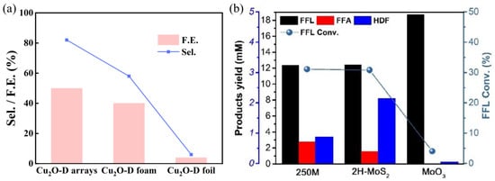 The surface morphology of catalysts significantly influences mass diffusion and electron transfer during reactions. Optimized structures can enhance catalytic performance for higher HDF selectivity. Ma et al. [] developed a Cu2O nanowire array structure for FF conversion and C-C coupling. In strongly alkaline electrolyte (pH 14), this morphology achieved 83.5% HDF selectivity. Comparative tests showed markedly reduced dimerization selectivity when using foil or foam catalysts instead of nanowire arrays (Figure 7a). The array structure suppresses diffusion of in situ formed radicals, increasing their local concentration to promote radical collision and HDF formation. Another study supports this finding. Huang et al. [] prepared octahedral and hexagonal MoS2 electrodes on carbon supports using a hydrothermal method, controlling the distribution of structural phases by varying annealing conditions to achieve over 98% FF conversion. The authors observed that the ratio of octahedral and hexagonal structures played a dominant role in reaction selectivity. MoS2 electrodes rich in octahedral structures showed 94.4% selectivity for FA, while those rich in hexagonal structures exhibited 42.7% selectivity for HDF, as shown in Figure 7b.