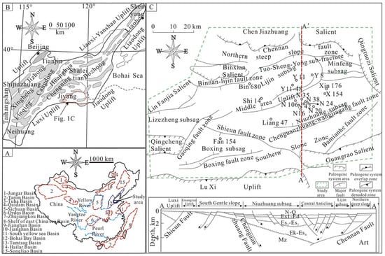 Geological overview of the study area. ((A) Location of the Bohai Bay Basin in China; (B) the tectonic unit division of Bohai Bay Basin; (C) the tectonic unit division of Dongying sag and a south-to-north structural cross-section).