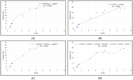 The fitting equation of salinity by Sr/Ba is shown in Table 1 and Figure 2. By comparing logarithmic fitting, linear function fitting, and multiple function fitting, it is found that the fitting of hexagonal polynomials has the best effect. However, the discriminant effect of Sr/Ba is not obvious in the application process. We sought to improve the recognition of Sr/Ba in a sedimentary environment by the selective extraction method [33]. The sediments were soaked in hydrochloric acid, and only the strontium and barium that migrated into the sediments during the deposition process were extracted, as far as possible, so as to eliminate the interference of strontium and barium from other sources on the identification of the sedimentary environment to the greatest extent.